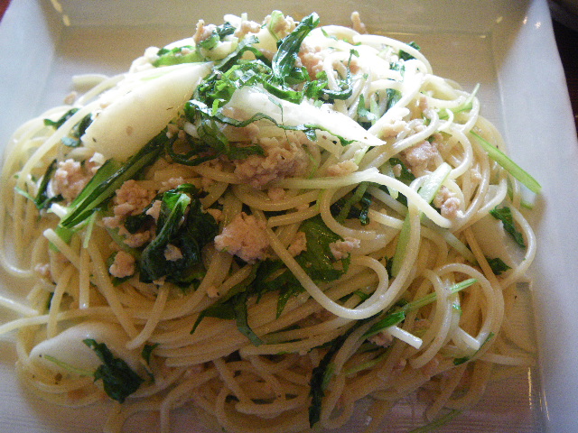 カブと水菜の鳥そぼろパスタ。