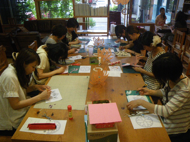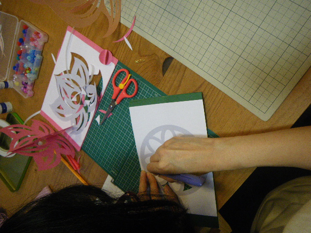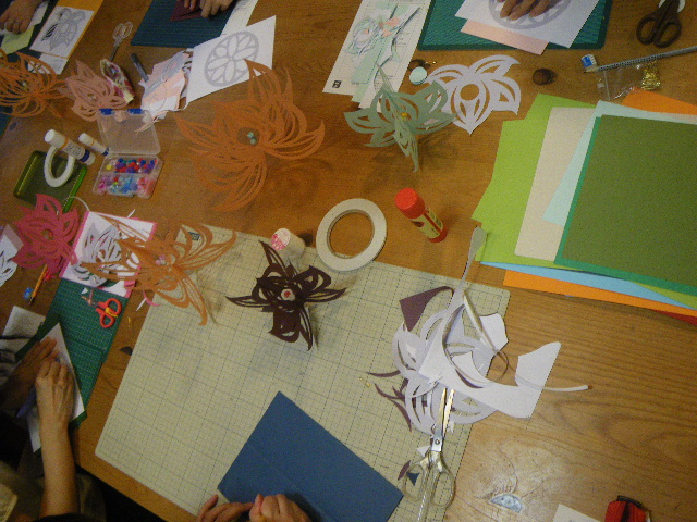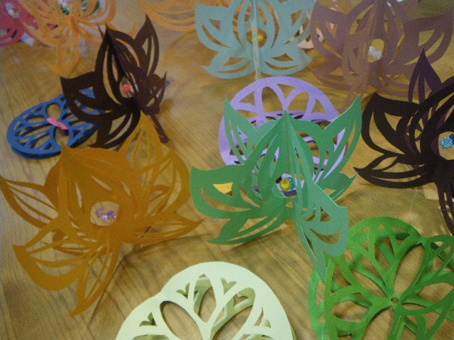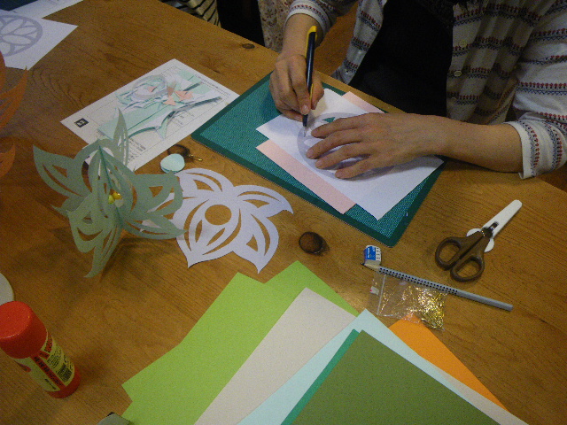 8名の皆さんが蓮のモビール作り。